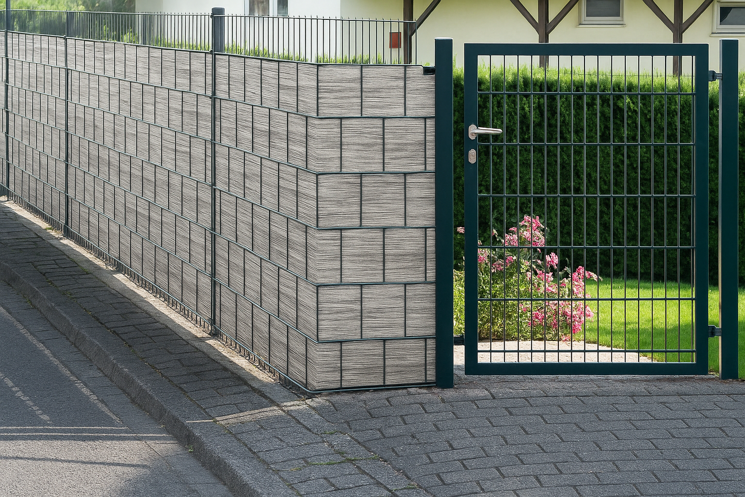 Elegante Zaungestaltung mit Sichtschutzstreifen in Steinoptik